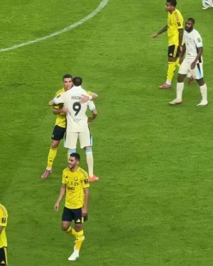赛后C罗与本泽马拥抱致意,两人曾在皇马并肩作战342场比赛。