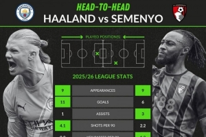 哈兰德与塞梅尼奥数据对比:前者进球和射门更多,后者助攻数占优