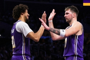 厥功至伟!湖人官方晒赢球海报 东契奇与海斯击掌画面登上封面