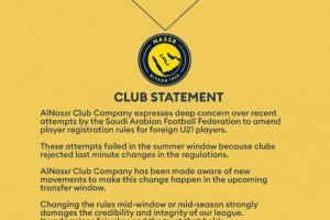 体育资讯11月7日讯 利雅得胜利俱乐部发表官方声明,俱乐部对沙特阿拉伯足球联合会近期试图修改外籍U21球员注册规则表示深切关注。