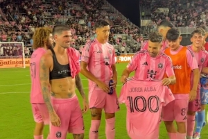 阿尔巴首发出战,助攻阿连德破门,此役是他为迈阿密国际出战的第100场比赛,阿尔巴获赠100场纪念球衣,并与队友合影庆祝。