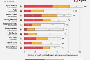 本赛季西甲参与有效进攻排名:姆巴佩106次居首,佩德里89次第二