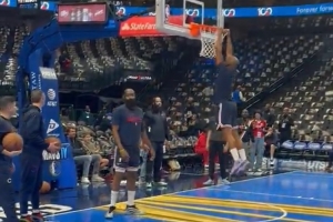 40岁还能飞!灯泡连线!赛前热身哈登助攻保罗空接暴扣