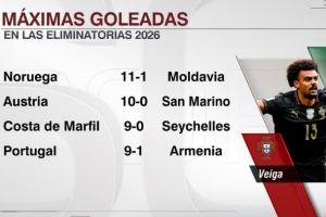 本届世预赛最大分差榜:挪威11-1大胜居首,葡萄牙9-1第四