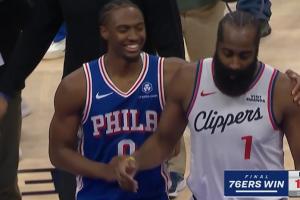 气着呢!马克西一路搂着哈登试图寒暄 哈登左右游走没心情理