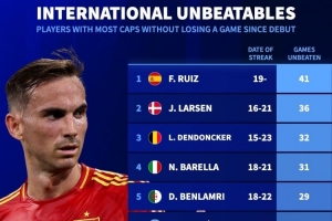 体育资讯11月20日讯 德国转会市场统计了本世纪球员在国家队的连续不败场次数据,并列出榜单,法比安·鲁伊斯连续41场不败居首。