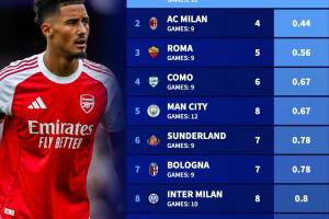 最强防线阿森纳12场仅丢3球五大联赛最少,米兰9场丢4球第二