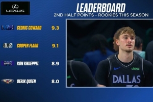 本赛季新秀下半场场均得分榜:科沃德9.3分最多 弗拉格9.1分第2