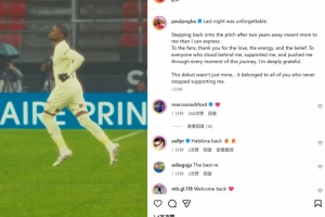 博格巴社媒:时隔2年重返球场对我意义非凡 感谢一直支持我的人们